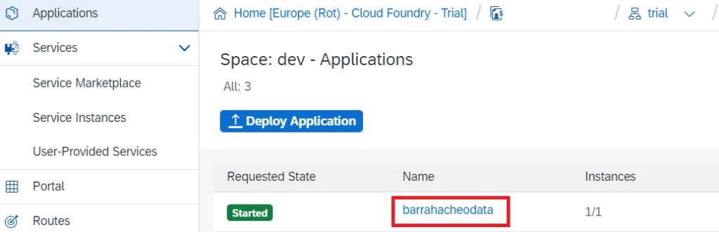 En nuestro SCP Cockpit (en este caso en Cloud Foundry) podemos comprobar que ya tenemos nuestra aplicación corriendo.