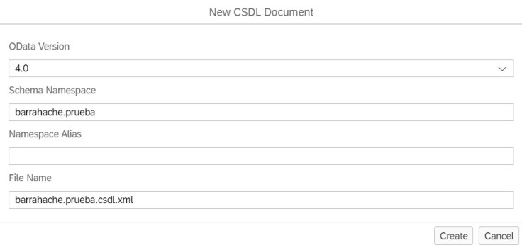Por ahora tenemos el proyecto creado pero vacío, por lo que el siguiente paso será hacer clic con el botón derecho en la carpeta del proyecto y crear Nuevo > Documento CSDL de OData y completar el formulario de la siguiente manera: