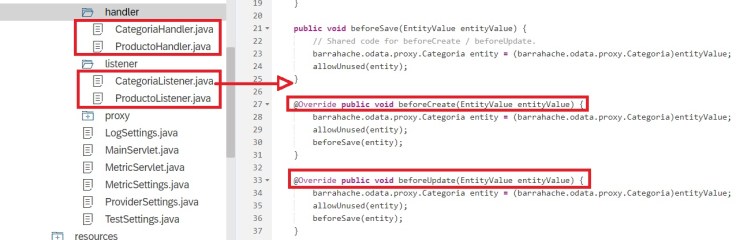 En la carpeta listener aparecerá una clase por cada EntityType creado con unos métodos que se ejecutan justo antes (beforeCreate) y después (afterCreate) de las determinadas operaciones CRUD que se hagan sobre esa EntityType. Esto nos permite hacer validaciones anteriores o acciones posteriores a cualquier operación