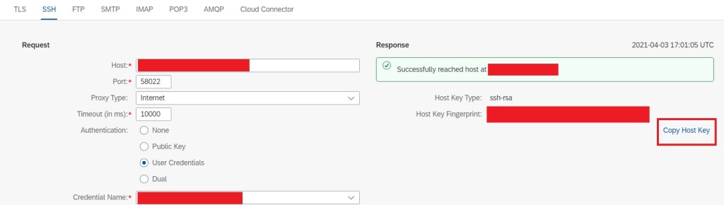 Una vez rellanados los datos de nuestro servidor SFTP e indicado las credenciales de usuario antes generadas, probamos la conectividad y una vez alcanzado el destino podemos copiar la clave del host.