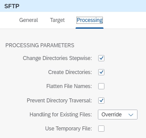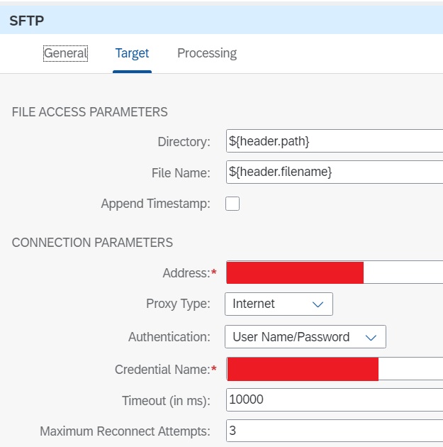 Pinchamos sobre dicho adaptador SFTP y podemos configurarlo. Sobre la pestaña Target indicamos los valores del servidor, el puerto, y hacemos referencia a las credenciales de usuario antes definidas.